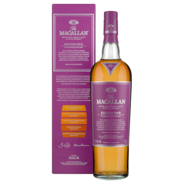 Macallan Edition no 5 được sáng tạo dựa trên thông điệp tôn vinh màu sắc tự nhiên, yếu tố màu sắc được thành hình qua quá trình phối trộn và đem ủ nghiêm ngặt trong các thùng gỗ sồi trong một khoảng thời gian nhất định. Thành quả cho ra những dòng rượu màu lúa mạch ánh dương mang sắc thái bí ẩn, quyến rũ.